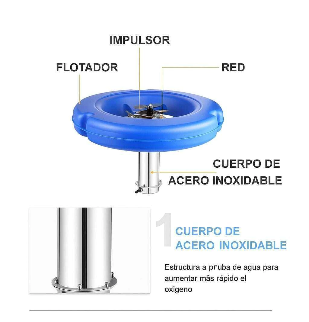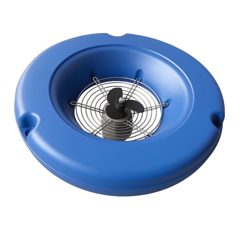 Aireador acuícola de superficie tipo splash con diseño flotante circular y hélice metálica protegida. Ideal para incrementar los niveles de oxígeno en estanques de cultivo acuático, optimizando la salud de peces y camarones.