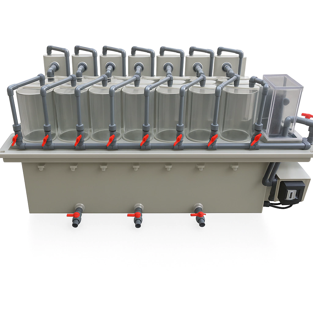Sistema completo de incubación diseñado para hatcheries de peces. Integrado con módulos de control automático, bombas de aire y agua, sistema de temperatura constante, filtración y lámpara UV. Ideal para incubación en masa con alta eficiencia, bajo consumo energético y operación continua.