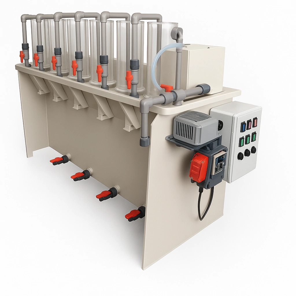 Cada unidad incluye cubetas de eclosión con flujo constante, estructura en PVC/SS anticorrosión y sistema de distribución uniforme de aire y agua.
